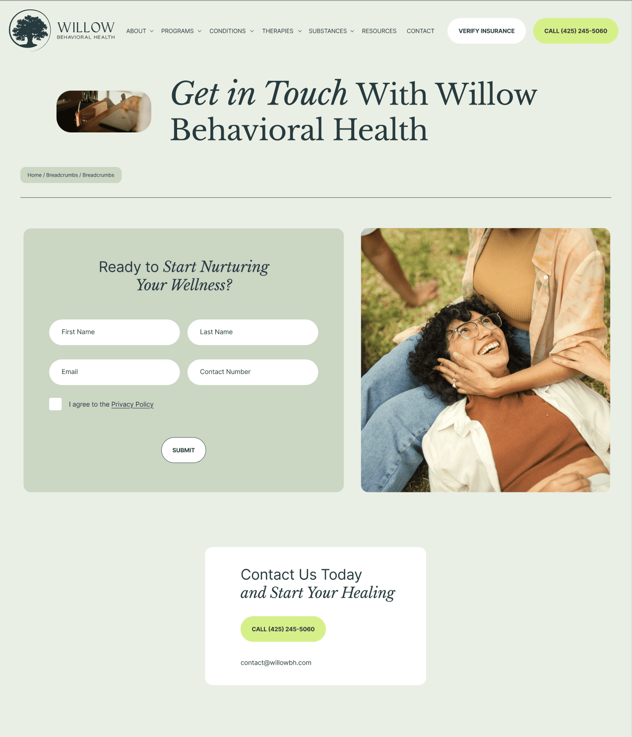 Primary CTAs to “Call the Facility” and “Verify Insurance” are instantly accessible and cleanly integrated within the hero section, designed for both clarity and action.